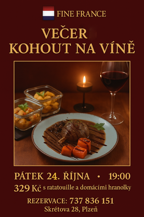 Kohout na víně s ratatouille a domácími hranolky (329,- Kč).